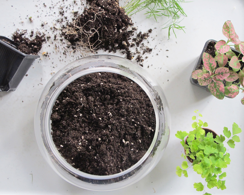 Place your plants in the soil. Add a little extra soil to cover the roots and cover the plants evenly. Place the terrarium in location that gets indirect light. Water lightly, a mister works well.
